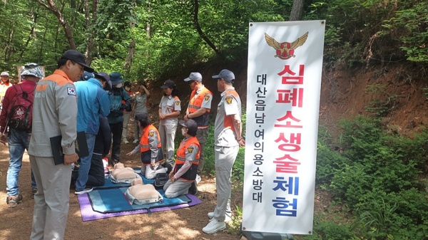 대산여성의용소방대(대장 박경희)는 지난 5월 18일 10~13시 황금산 등산로 입구에서 20여 명의 대원이 참여해 등산객들에게 산불 예방 홍보 활동과 심폐소생술 체험존을 운영했다.