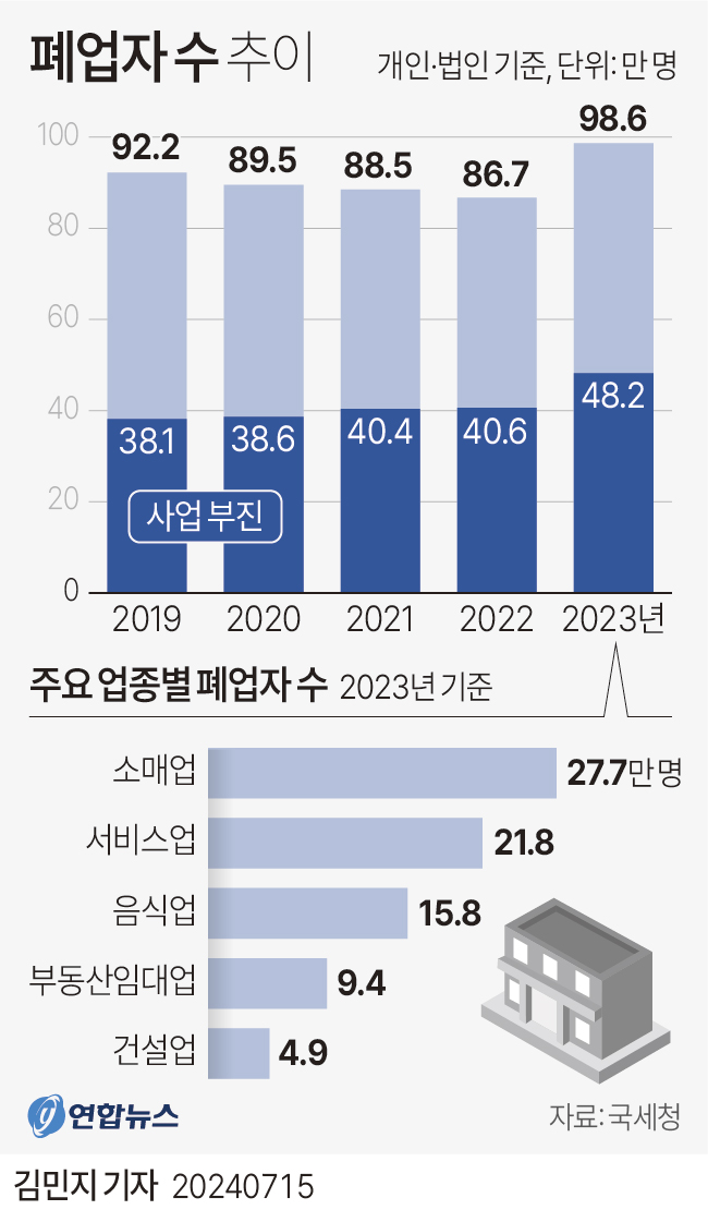 폐업 사유별로 분석해 보면 ‘사업 부진’이 48만 2183명으로 가장 많았다. 전년(40만 63225명)과 비교하면 7만 5958명(18.7%) 늘어나 역대 최대폭 증가다. 업종별로는 소매업 폐업이 27만 6535명으로 가장 많았고, 서비스업(21만 7821명), 음식업(15만 8279명) 등 내수와 직접 연관된 업종의 폐업이 늘었다.
