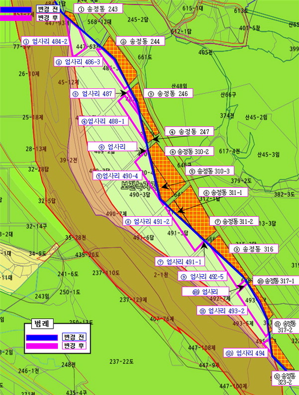 대상지에 대한 경계변경이 이뤄질 경우에는 1만 1843㎡ 규모의 엄사리 토지가 송정동으로 편입된다.