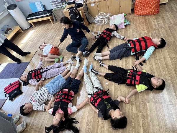 실내 체험(이론) 교육으로는 생존수영에 대한 유아의 긴장과 두려움을 해소하고자 체험 형태(4차시)로 원내에서 운영했다.