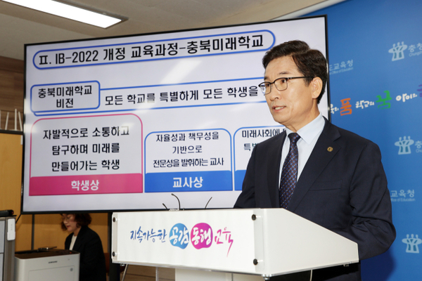 충북도교육청도 IB 프로그램 도입, 운영 준비에 박차를 가하고 있다. 충북교육청이 IB 도입을 공식 선언한 것은 지난 5월 8일이다. 윤건영 교육감은 이날 기자회견을 열어 "국제인증 학교 교육 프로그램 도입을 추진하기로 했다"고 밝혔다.