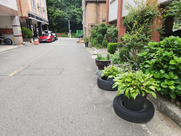 1일 청주시 흥덕구 봉명동의 한 주택가에는 도로변 곳곳에 화분과 타이어를 쌓아 놓은 모습이 쉽게 눈에 띄었다. 이들 화분과 타이어는 건물 앞 주차를 막기 위해 설치한 것으로 보인다.