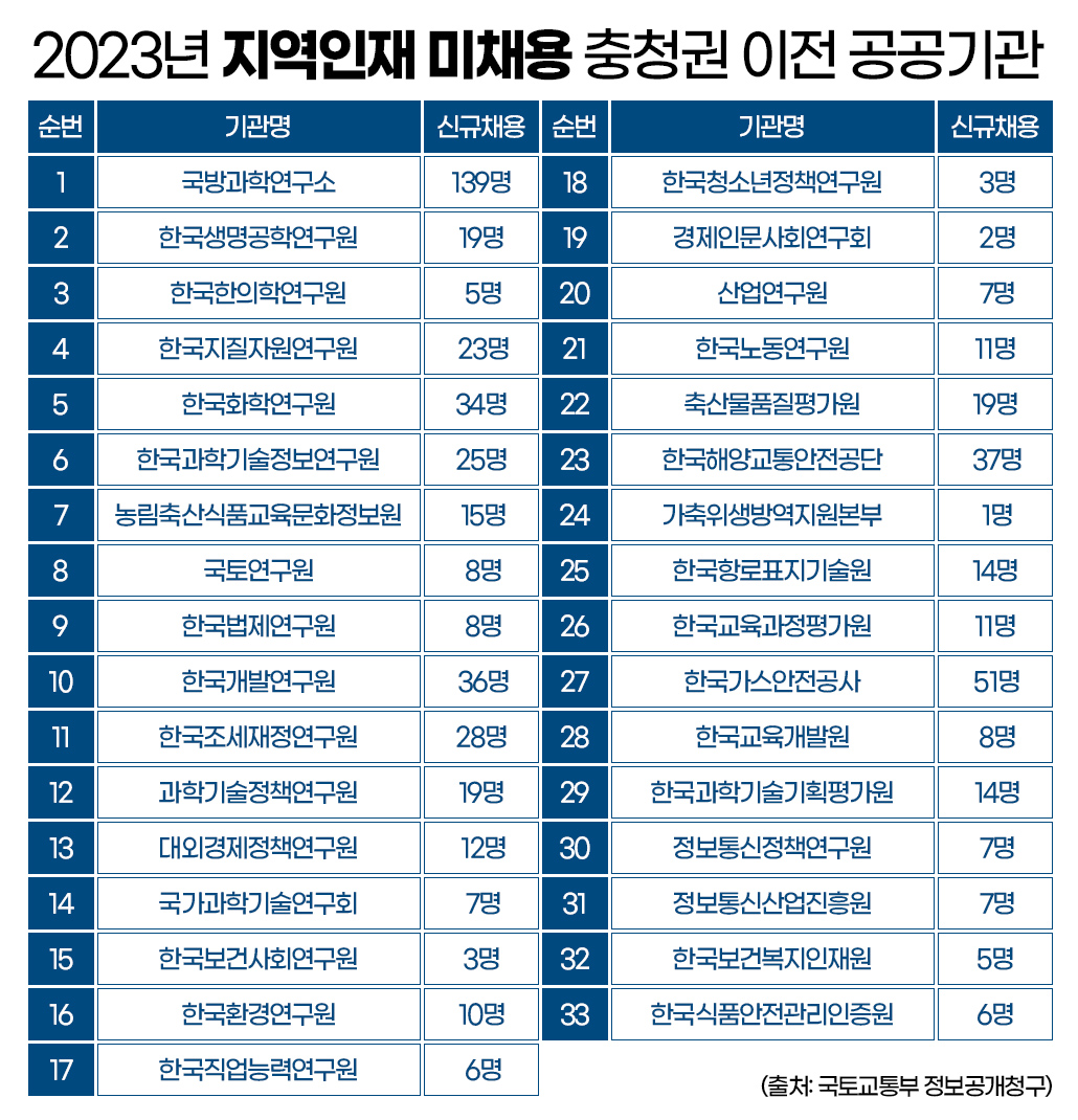 본보가 국토교통부에 정보공개청구해 확보한 ‘이전 공공기관의 연차별 지역인재 의무채용 실적’에 따르면 지역인재를 1명도 고용하지 않은 충청권 공공기관은 지난해 기준 33곳이다.