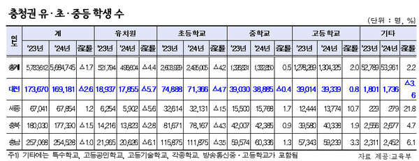 조사 결과에 따르면 지난해 17만 3670명이었던 대전의 유·초·중등 학생 수는 올해 2.6% 감소해 16만 9181명으로 집계됐다.