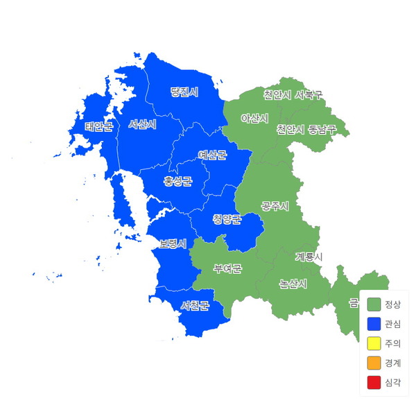 반면 충북 대청댐과 전북 용담댐으로부터 물 공급을 받고 있는 충남 천안, 아산, 공주, 논산, 금산 등은 아직까지 정상 단계를 유지하고 있는 것으로 나타났다.