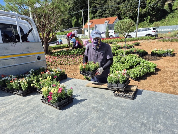 축제장 최고의 포토 스팟에는 꽃탑과 화단 3개를 조성 중이다.