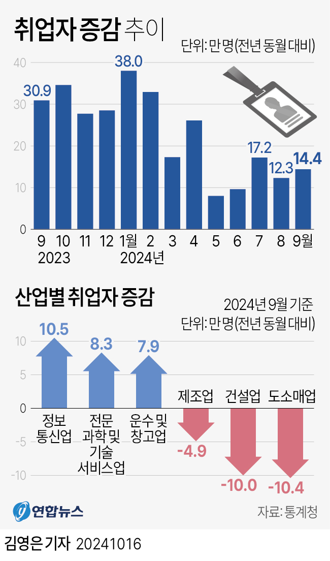 이 두 부문이 약세를 보이면서 일용근로자들의 일자리가 크게 줄어든 것으로 분석된다. 전체 임금근로자는 68만 1000명으로 지난해 9월보다 3000명(0.4%) 증가했고, 비임금근로자는 27만 6000명으로 1000명(0.3%) 늘었다.