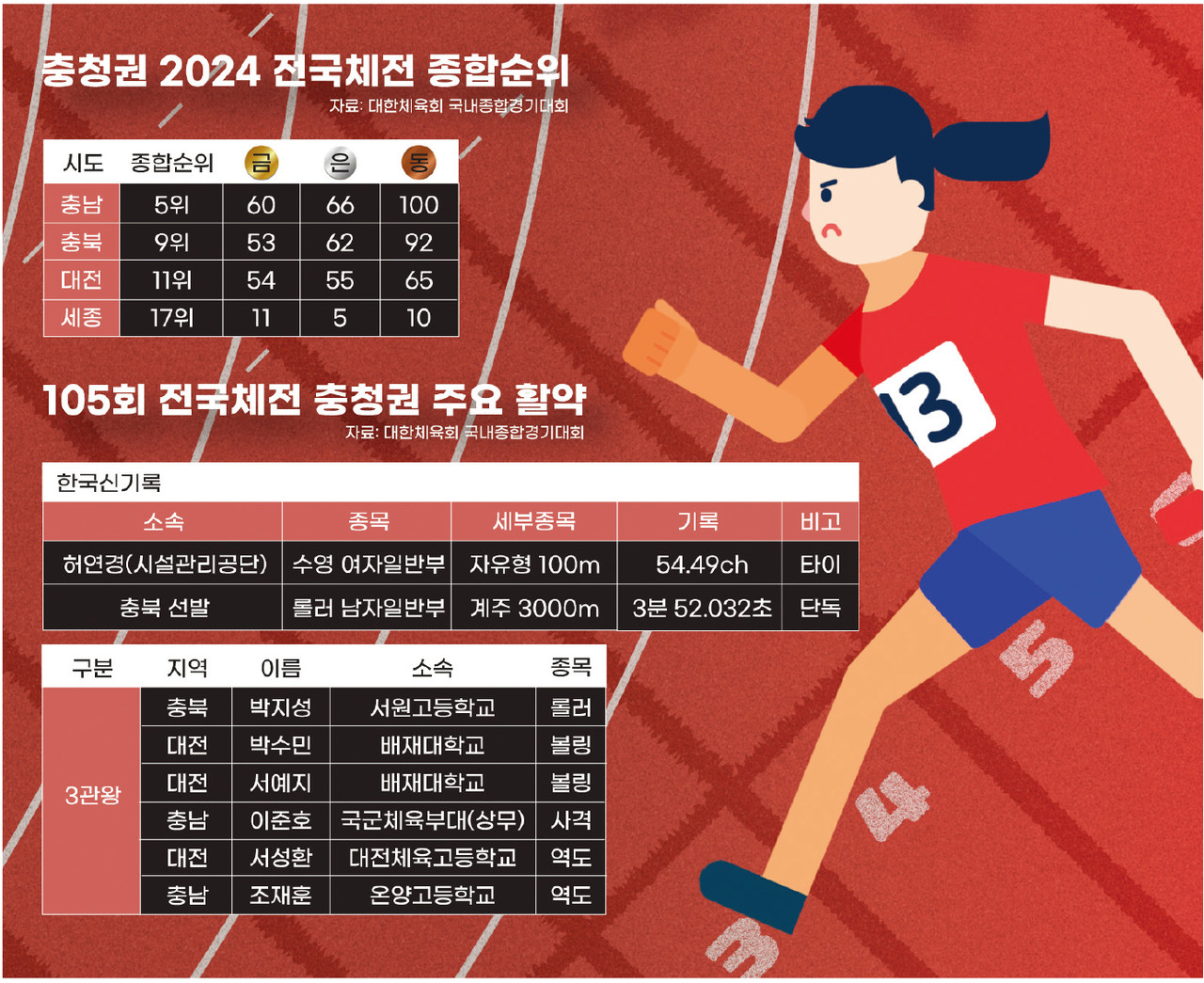 [충청투데이 심형식 기자] 충청권 선수들이 1년 노력의 결실을 맺는 전국체육대회에서 후회 없는 열전을 펼쳤다. 대전, 세종, 충북, 충남은 11~17일 경남 김해에서 열린 제105회 전국체전에서 지역을 대표해 출전한 총 3973명의 선수들의 활약에 힘입어 선전했다.