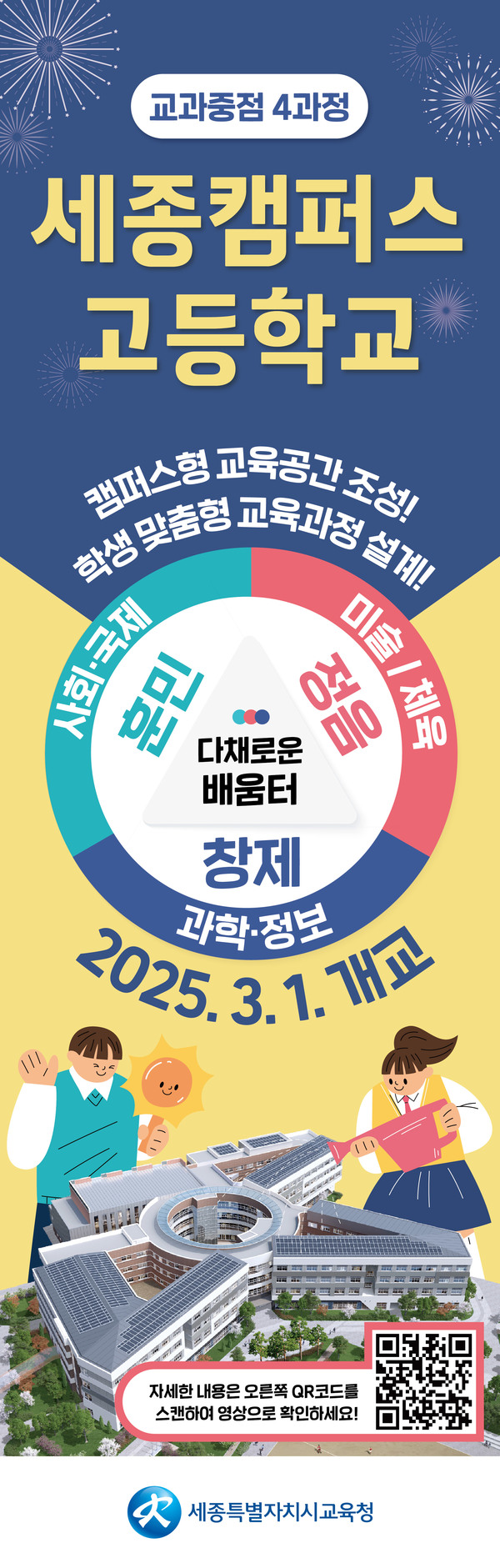 세종시 신도심인 행정중심복합도시 6-3생활권(산울동)에 둥지를 튼 세종캠퍼스고는 웅장함과 내실을 갖춘 최첨단 교육공간이다.