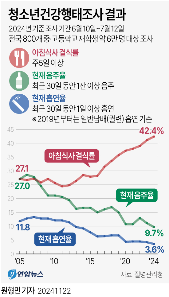 교육부와 질병관리청이 매년 전국 800개 표본학교를 대상으로 조사한 올해 청소년건강행태조사 결과는 시사하는 바가 크다. 청소년 흡연율의 경우 조사를 시작한 20년 전과 비교해 3분의 1 수준으로 감소하는 추세를 보였다. 대전과 세종의 경우 각각 2.6%와 3.9%로 전국 평균 3.6% 밑돌았고 충북과 충남은 평균보다는 높았지만 전년보다는 감소 추세를 보인 점이 다행이다. 음주율 역시 대전과 세종, 충남 모두 전국 평균보다는 낮았다. 전년과 비교해서도 감소 추세가 뚜렷했다.