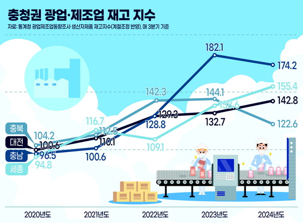 충청권 내 광업과 제조업 재고지수(통계청)는 최근 1년 새 역대 최대치를 갱신한 바 있으며 2020년을 기준으로 올 3분기 충남지역 재고 지수는 74% 이상, 대전과 세종은 각각 42%, 55% 이상 증가했고 충북은 22% 오른 상황이다.