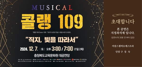 카잘스챔버오케스트라(단장 구동숙)가 주최하고 극단 청년극장과 SY춤Company가 주관하는 ‘콜랭 109-직지, 빛을 따라서’가 오는 7일(오후 3·7시) 충북교육문화원 대공연장에서 막을 연다.
