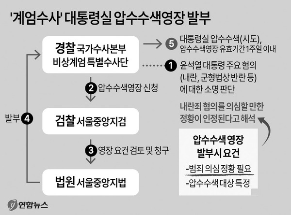 국수본 수사 인력 10여명은 이날 수사 대상으로 ‘대통령 윤석열’이 적시된 영장을 제시하며 압수수색 절차를 시작했다.