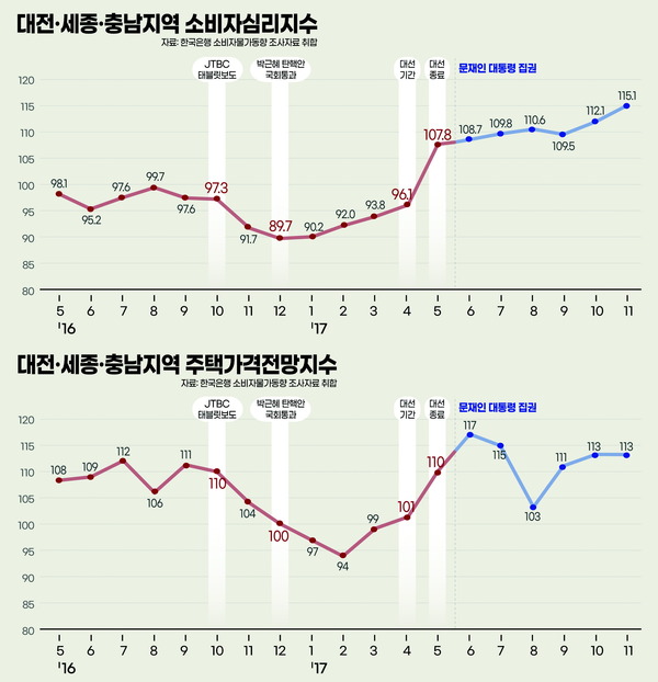 대전·세종·충남의 주택가격전망지수도 2016년 9월 기준 111로 집계돼 주택가격에 대한 상승 기대감이 반영된 것으로 분석됐지만 탄핵정국의 여파로 2017년 2월 94까지 떨어졌다.