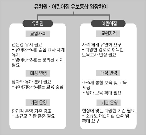 어린이집 측은 유보통합의 본래 취지대로 0~5세 모든 아이들에게 동일한 보육 및 교육 서비스를 제공해야 한다고 맞선다.
