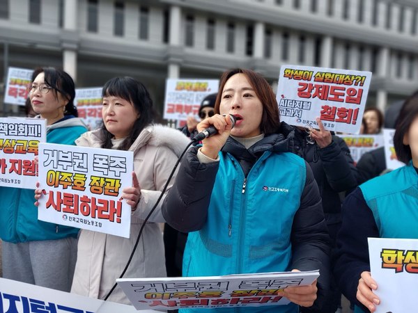 전교조 대전·세종·충북·충남지부는 16일 세종정부청사 교육부 앞에서 기자회견을 열어 정부의 지방교육재정교부금법 개정안 거부권 행사를 비판하고 초·중등교육법 개정안 공포를 요구했다.