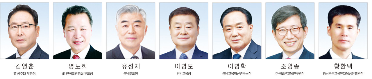 5일 지역 교육계 등에 따르면 현재 출마를 준비 중인 후보로는 (가나다순)김영춘 전 공주대 부총장, 명노희 전 한국교원총회 부의장, 이병도 천안교육장, 이병학 충남교육혁신연구소장, 조영종 한국바른교육연구원장 등이 자천타천 거론된다.