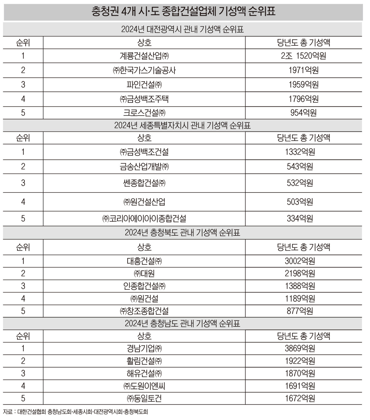 대전 ‘계룡건설'·세종 ‘금성백조’·충북 ‘대흥건설’·충남 ‘경남기업’ 1위