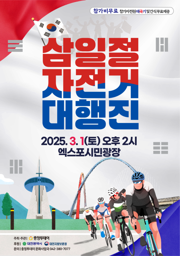 순국선열의 희생정신을 되새기고 시민들이 함께 하나 되는 ‘2025 3·1절 자전거대행진’이 오는 3월 1일 대전엑스포시민광장에서 열린다.