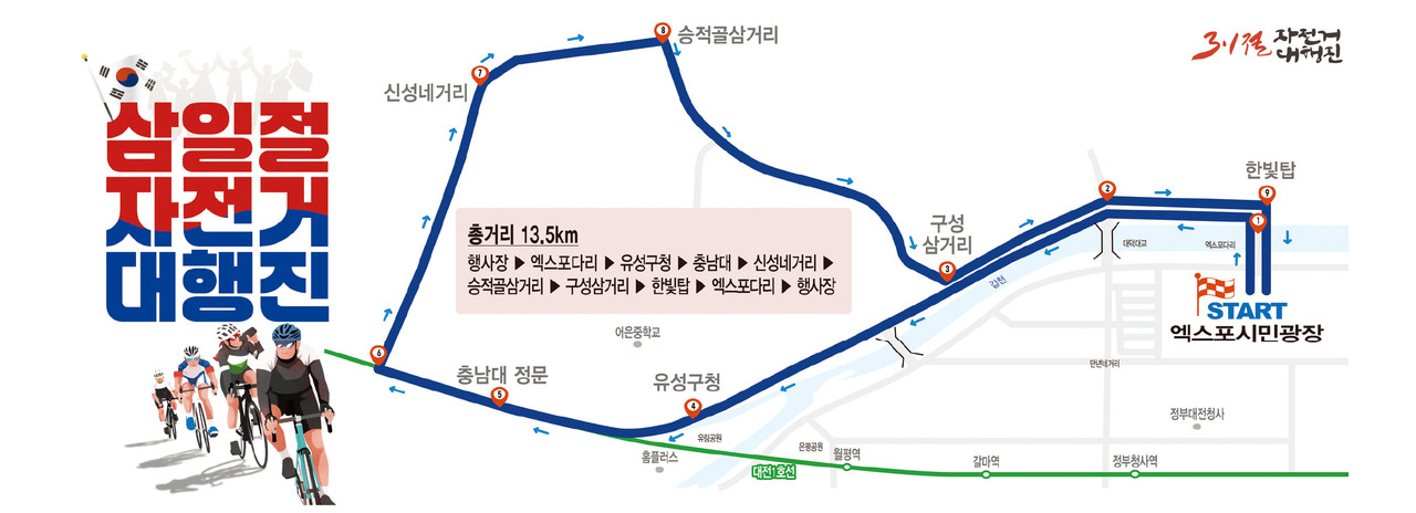 자전거 애호가는 물론 일반 시민 누구나 참가할 수 있으며, 참가자들은 태극기를 자전거에 부착한 채 엑스포다리를 지나 대전의 도심과 갑천을 따라 페달을 밟으며 3·1절의 의미를 되새길 예정이다.
