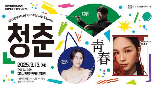 신춘음악회 ‘청춘(靑春)’은 다채로운 협연 무대로 봄의 소리를 전하는 공연이다. 봄의 기운을 국악기에 담은 국악관현악곡과 한국의 아름다운 선과 몸짓이 돋보이는 무용, 매력적인 음색을 가진 오보에, 청량한 음색의 경기민요까지 다채로운 협연 무대로 구성된다. 이번 공연에는 부드러운 카리스마로 관객을 사로잡는 원영석 이화여자대학교 한국음악과 교수가 객원 지휘를 맡는다. 최근 SNS에서 ‘한국판 모아나’로 불리는 경기민요 아티스트 송소희, 독창적이고 폭넓은 레퍼토리 연구를 통해 다양한 음악적 색채를 보여주는 박지현 대전시립교향악단 부수석이 함께한다. 연주곡은 왕의 행차에 궁중음악 취타의 선율로 유려한 느낌을 주는 ‘취하고 타하다’, 봄의 소리와 함께 생명의 잔치를 벌이는 ‘춘무’, 잔잔한 금강을 지나 바다로 향하는 강의 모습을 표현한 ‘역동의 강’을 선보인다. 특히 ‘춘무’에서는 무용단이 함께 해 봄의 역동감과 활력을 느껴볼 수 있다. 오보이스트 박지현은 첫사랑의 설렘을 추억할 수 있는 오보에 협주곡 ‘Serenade for the First love’를 연주한다. 송소희는 봄의 기운을 가득 담은 노래 ‘매화타령’과 사랑하는 사람을 그리워하는 ‘달무리’로 관객들을 사로잡을 예정이다. 공연은 13일 오후 7시 30분 대전시립연정국악원 큰 마당에서 열린다.
