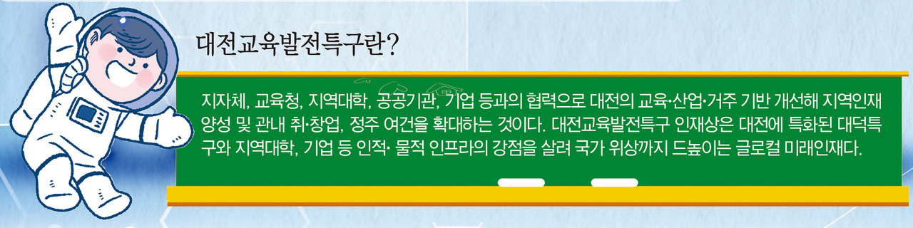 올해 대전교육발전특구 비전은 ‘지역이 주도하는 교육개혁, 미래가 주목하는 일류경제도시 대전’이다. 대전이 과학기술을 기반으로 한 일류경제도시로 나아가기 위해 지역을 이끌어갈 혁신 인재를 양성하는 것이 목표다.