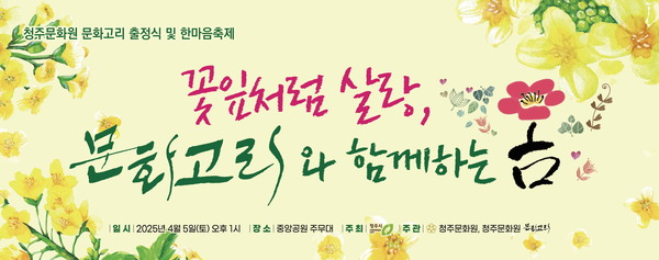 [충청투데이 김진로 기자] 청주문화원(원장 강전섭) 시민문화예술동아리 ‘문화고리’(회장 배소윤)가 5일 오후 1시 청주 중앙역사공원 주무대에서 ‘2025 문화고리 출정식 및 한마음축제’를 개최한다.
