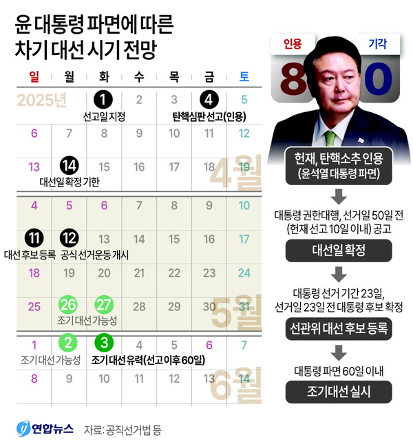 또 헌재의 탄핵 심판 선고와 함께 현 정권의 임기가 정상적으로 끝났다면 2027년 치러질 예정이었던 제21대 대통령 선거가 2년 가까이 앞당겨지는 ‘조기 대선’이 확정됐다.