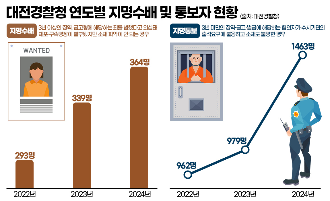 대전청의 지명수배 발생건수(명)는 2022년 293명, 2023년 339명, 지난해 364명으로 해마다 늘고 있다.
