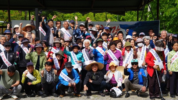 7일 충남 청양 까치유원지 일원에서 열린 지천댐 신속추진 주민결의대회에서 찬성측 주민들이 단체사진을 촬영하고 있다. 사진=박현석 기자