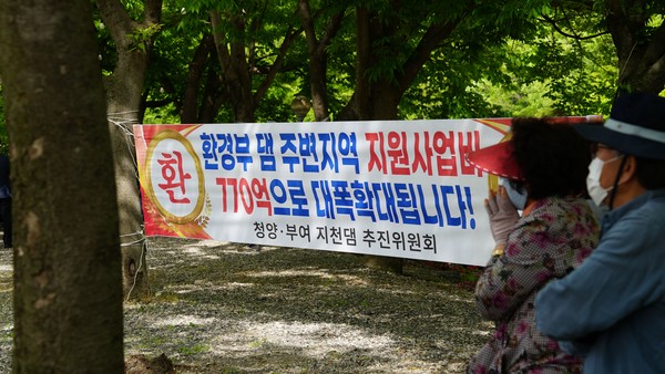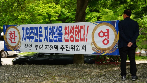 7일 충남 청양 까치유원지 일원에서 열린 지천댐 신속추진 주민결의대회에서 참석한 주민이 현수막을 보고 있다. 사진=박현석 기자