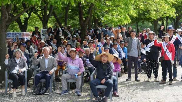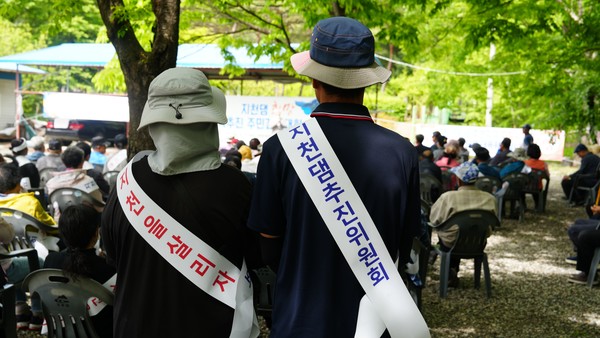 7일 충남 청양 까치유원지 일원에서 열린 지천댐 신속추진 주민결의대회에서 참석한 주민들이 경청하고 있다. 사진=박현석 기자