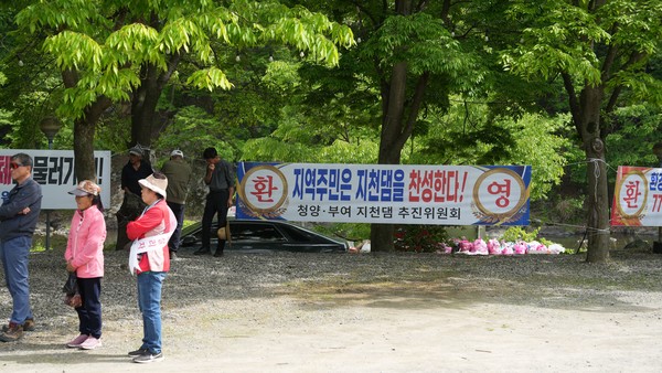 7일 충남 청양 까치유원지 일원에서 열린 지천댐 신속추진 주민결의대회 지천댐 추진을 촉구하는 현수막이 걸려 있다. 사진=박현석 기자