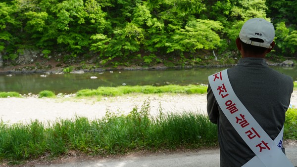 7일 충남 청양 까치유원지 일원에서 열린 지천댐 신속추진 주민결의대회에서 찬성측 주민이 지천을 바라보고 있다. 사진=박현석 기자