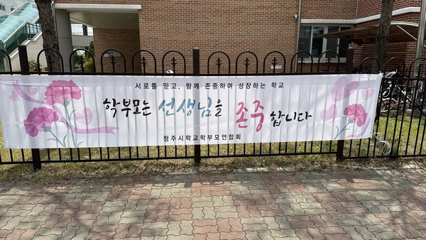 충북에서는 2022년 이 같은 문구로 스승 존중 캠페인이 시작됐다. 교사는 학부모에게 ‘학부모의 자녀교육 노고에 감사드립니다’라는 문구의 현수막으로 화답한다.
