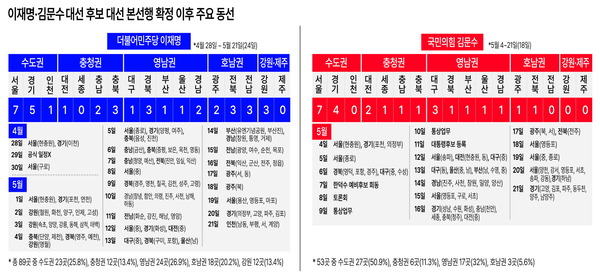 이런 행보는 양 후보 모두 이번 선거에서 수도권과 영남권을 전략적 요충지로 삼고 ‘효율성 중심’의 유세 전략을 택했기 때문이란 분석이다.