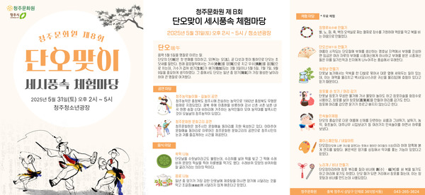 단오맞이 세시풍속 체험마당은 청주농악놀이패가 길놀이 공연으로 단오를 맞이하고, 청주문화원 문화고리가 시민들의 눈과 귀를 즐겁게 할 음악과 공연을 펼친다.