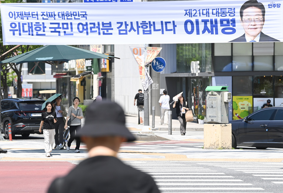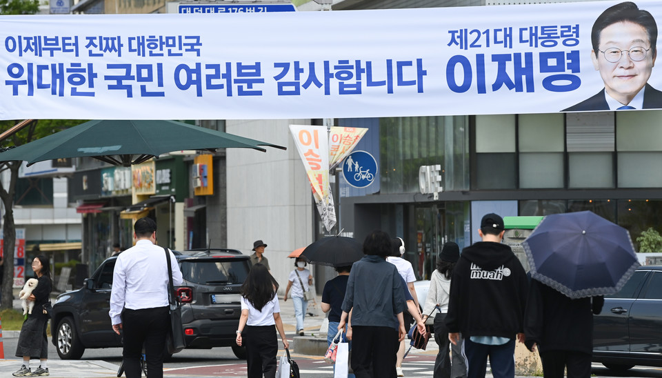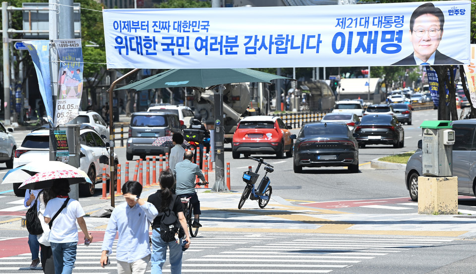 제21대 대통령선거 다음 날인 4일 대전 서구 큰마을네거리에 이재명 대통령 당선사례 현수막이 걸려있다. 김주형 기자 kjh2667_@cctoday.co.kr