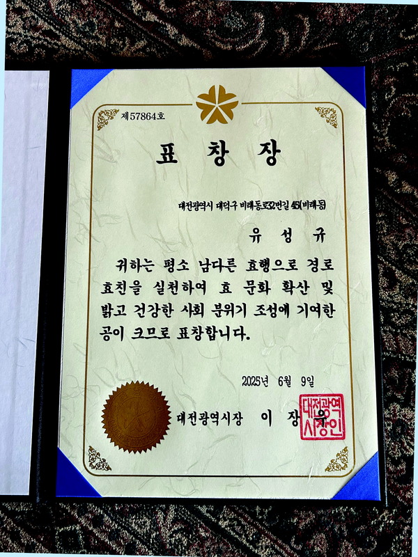 2. 대전시 효행 표창장 수상자 유성규 씨