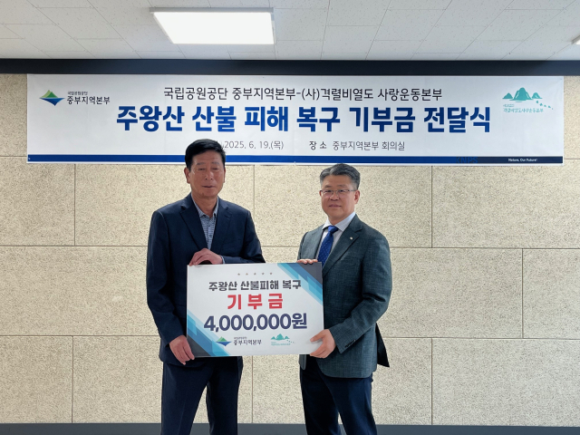[충청투데이 박기명 기자] (사)격렬비열도 사랑운동본부(회장 윤현돈)는 지난 19일 국립공원공단 중부지역본부(본부장 김대현)를 방문, 주왕산국립공원 산불 피해지역 복구를 위한 성금을 전달했다.