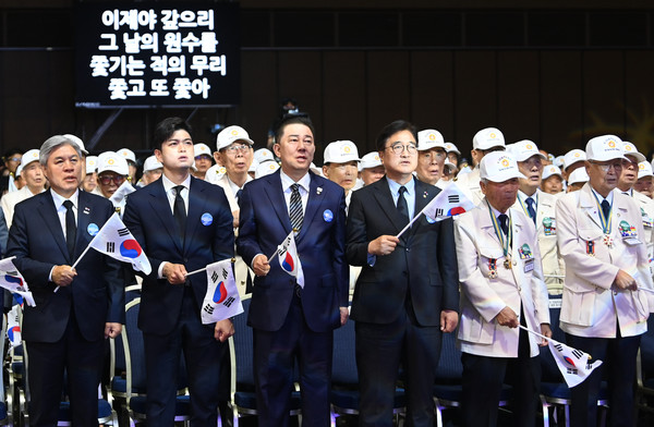 25일 대전컨벤션센터에서 열린 6·25전쟁 제75주년 행사에 참석한 김용태 국민의힘 비상대책위원장과 김병기 더불어민주당 당 대표 직무대행 겸 원내대표, 우원식 국회의장, 6·25 참전 유공자들이 6·25의 노래를 부르며 태극기를 흔들고 있다. 김주형 기자 kjh2667_@cctoday.co.kr