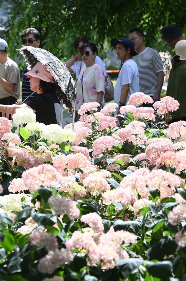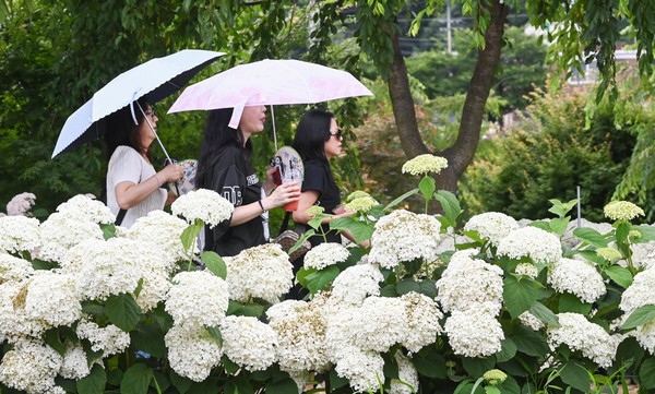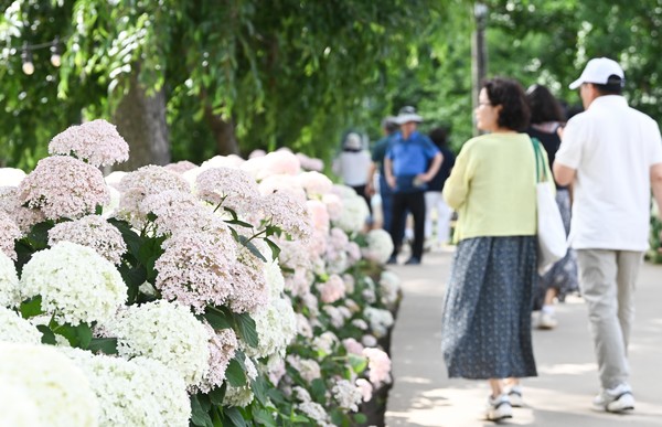 [충청투데이 김주형 기자] 29일 충남 공주시 유구 색동수국정원에서 열린 수국 축제를 찾은 시민들이 활짝 핀 수국을 보며 즐거운 휴일을 보내고 있다. 김주형 기자 kjh2667_@cctoday.co.kr