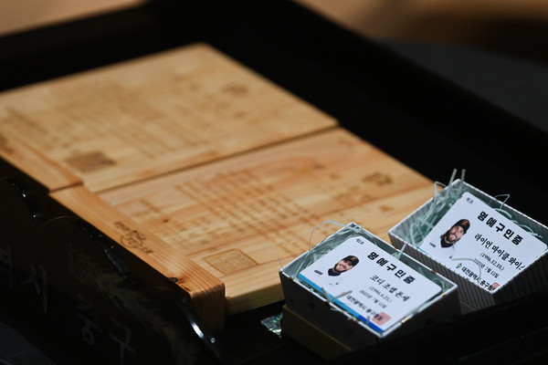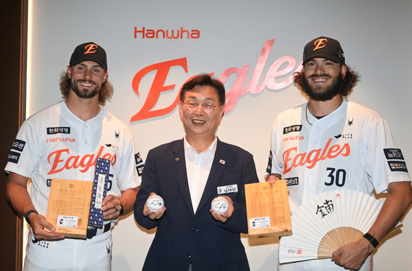 [충청투데이 김주형 기자] 15일 대전 한화생명 볼파크에서 김제선 중구청장이 한화이글스 라이언 와이스와 코디 폰세 선수에게 명예구민증을 전달한 뒤 기념촬영을 하고 있다. 김주형 기자 kjh2667_@cctoday.co.kr