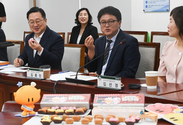 꿈돌이 호두과자 출시 행사가 열린 22일 대전시청 중회의실에서 이장우 대전시장 (오른쪽 세 번째)과, 윤성국 대전관광공사 사장 (왼쪽 세 번째)를 비롯해 참석한 내빈들이 호두과자를 시식하고 있다. 김주형 기자 kjh2667_@cctoday.co.kr