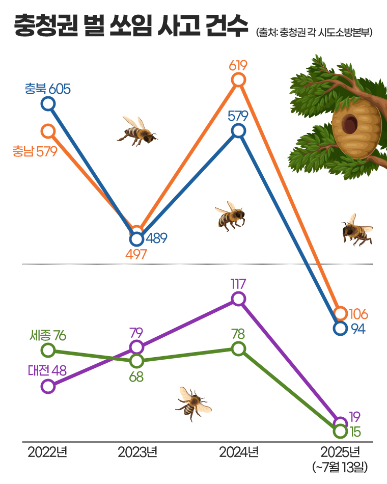 이를 포함해 2022~2024년 충청권의 벌 쏘임 사망자는 충남 9명, 충북 2명, 대전·세종 각 1명 등 13명에 이른다.