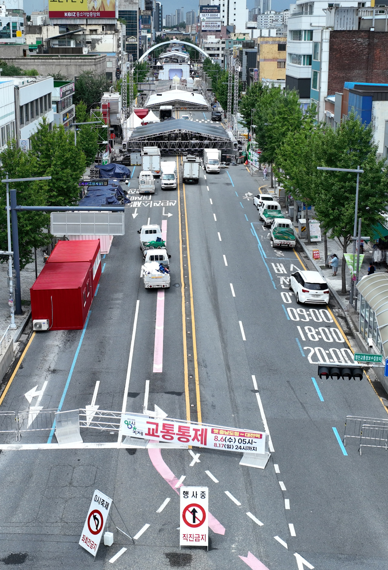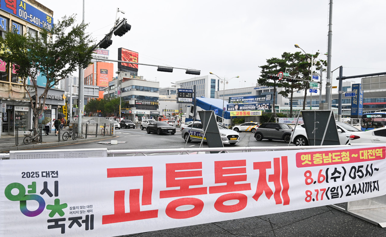 '2025 대전 0시 축제' 개막을 이틀 앞둔 6일 대전 중구 중앙로에서 축제 준비를 위해 교통을 통제하고 있다. 0시 축제 기간을 전후한 6일 오전 5시부터 17일 24시까지 중앙로와 대종로 일원 교통이 통제된다. 김주형 기자 kjh2667_@cctoday.co.kr