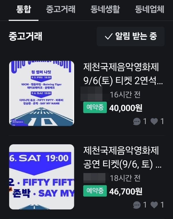 [충청투데이 이대현 기자] 중고 거래 플랫폼인 ‘A마켓’에 21회 제천국제음악영화제 공연 티켓이 지난해에 이어 또 매물로 등장했다.
