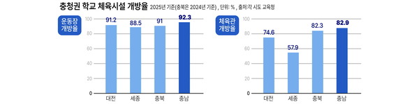 올해 지역별 학교 체육시설 개방률은 △대전 다목적강당(체육관) 74.6%, 운동장 91.2% △세종 다목적강당(체육관) 57.9%, 운동장 88.5% △충남 다목적강당(체육관) 82.9%, 운동장 92.3% △충북(2024년) 다목적강당(체육관) 82.3%, 운동장 91.0% 등이다.
