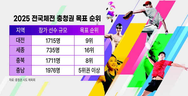 충북과 충남도 지난해보다 더 높은 순위를 목표로 막바지 준비에 속도를 내고 있다. 충북도체육회는 올해 1711명(선수 1209명, 임원 502명)을 전국체전에 파견한다. 지난해 참가인원인 1671명(선수 1204명, 임원 467명)보다 40명 더 늘었다. 올해 전국체전 목표는 8위권 진입이다. 앞서 충북체육회는 2023년 메달 194개(금 59개, 은 51개, 동 84개)를 획득해 10위를 기록했으며 지난해에는 메달 207개(금 53개, 은 62개, 동 92개)로 9위에 올라섰다.