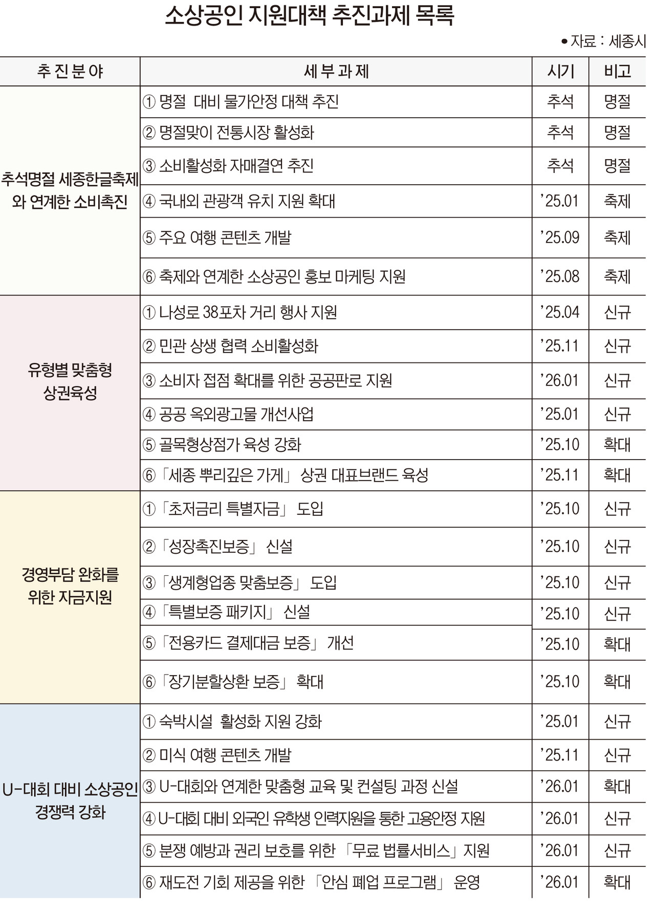 대책은 크게 △추석 명절·세종한글축제 연계 소비 촉진 △유형별 맞춤형 상권 육성 △자금 부담 완화를 위한 융자 지원 △2027년 충청권 하계유니버시아드(U-대회) 대비 소상공인 경쟁력 강화 등 4대 분야, 24개 세부과제로 구성돼있다.